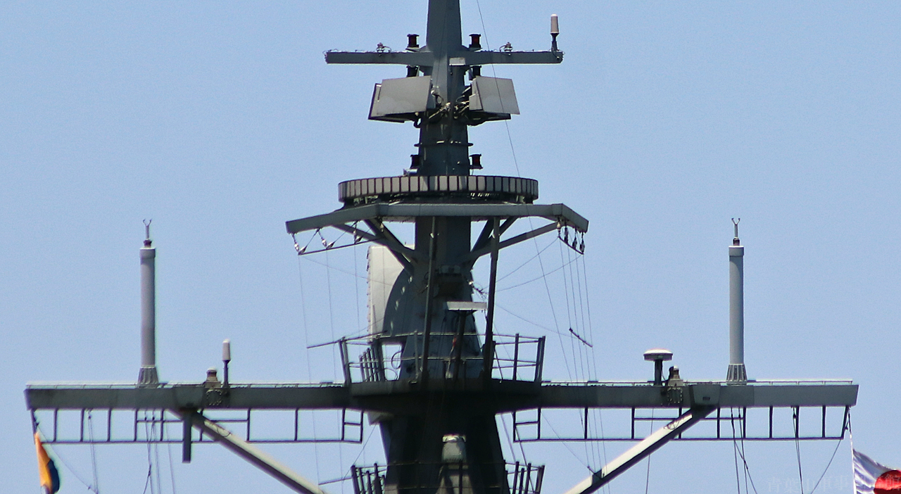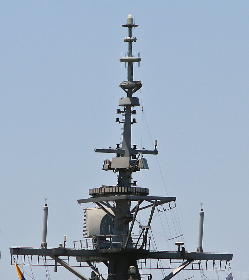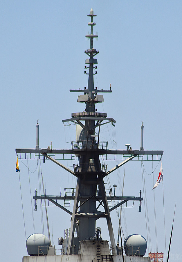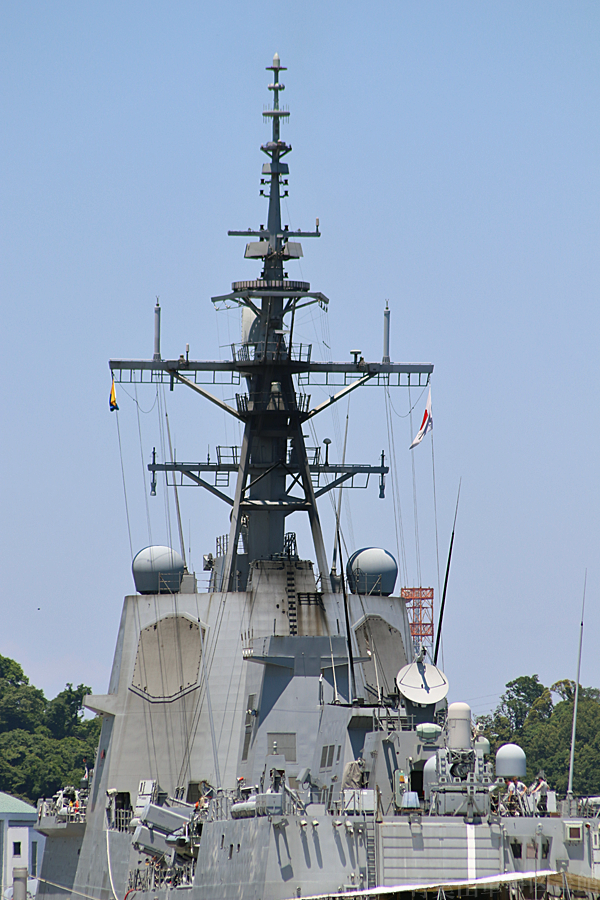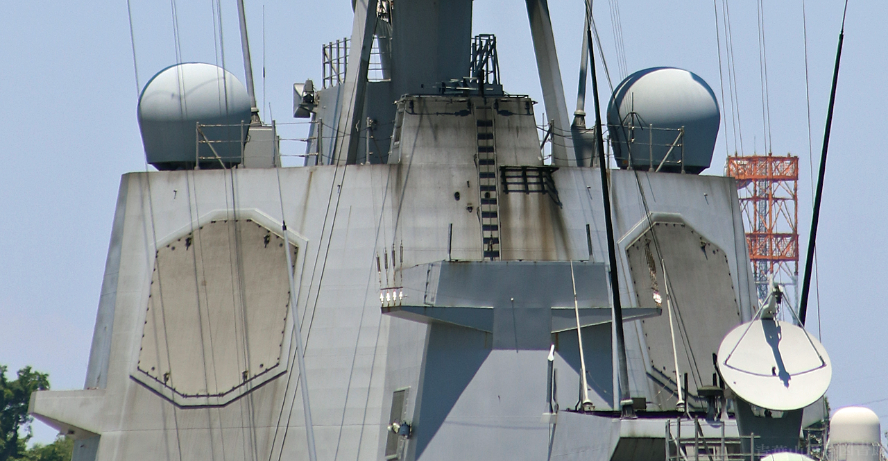 マストはステルス性考慮の角形断面三脚マスト。AN/SPY-1D(V)レーダー用アンテナはアーレイ・バーク級より高い位置にありますが、やはり低空目標探知能力に不安があるのか、AN/SPQ-9Bレーダを更に高いところに搭載しています。その上のリング状IFF、更に上の長方形4面CEC(共同交戦能力)アンテナも、イージス艦では国籍問わずお馴染みの装備となってきました。