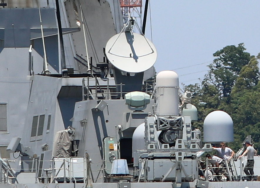 前部煙突から少し間が空いて後部煙突。その手前のAN/SPG-62射撃指揮レーダーは1基のみで、後部上構はアーレイ・バーク級などに比べてコンパクトになっていて、大きめのアンテナ台と言った方が良いかも。その一段下にある両端を切ったラグビーボールみたいなのはシリーズ2500電子光学追尾装置かな。その手前にファランクス・ブロックⅠB。